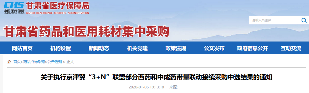 甘肃省医保局发布重磅通知,明确全省将从1月20日起正式执行京津冀"3+N"联盟带量联动采购中选结果。