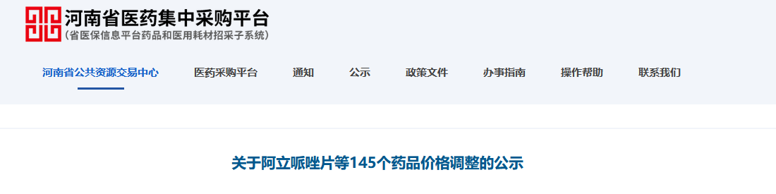 河南省医保局发布重磅公告:阿立哌唑片等145种药品价格调整方案正式进入公示阶段!