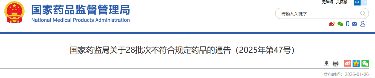 2026年1月6日,国家药监局发布2025年第47号通告,曝光24家企业生产的28批次药品不符合规定!