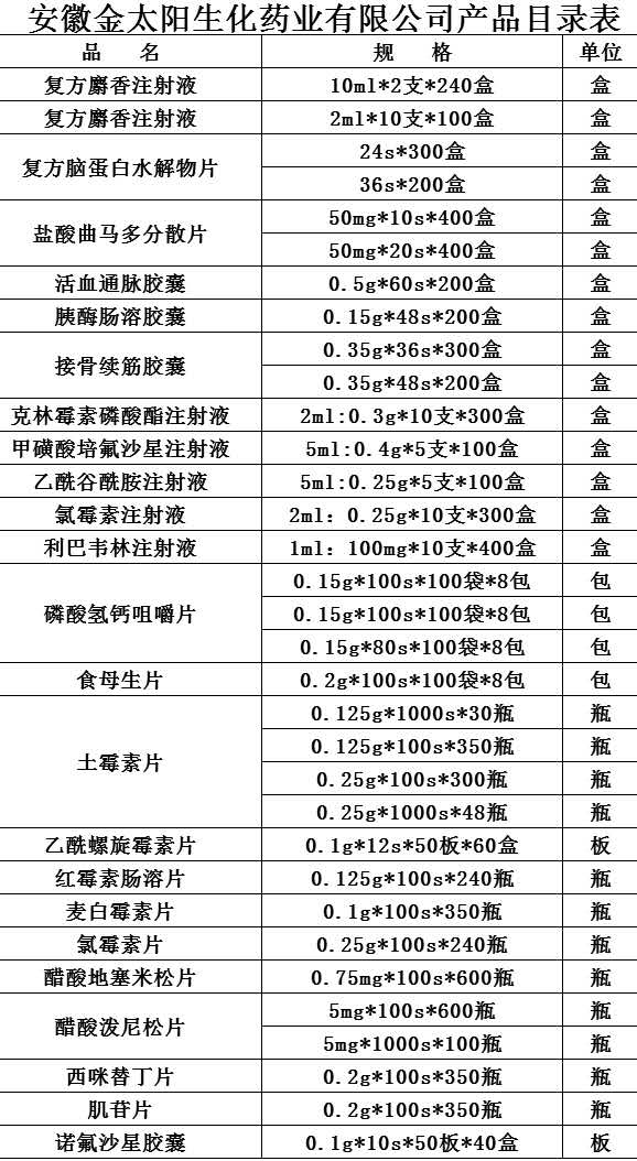 复方麝香注射液,复方脑蛋白水解物片,盐酸曲马多分散片,活血通脉胶囊,穿黄清热胶囊,接骨续筋胶囊,胰酶肠溶胶囊,,醋酸地塞米松片,醋酸泼尼松片,氯霉素片/针,肌苷片/针,庆大霉素,盐酸林可霉素,土霉素片,红霉素肠溶片等等百十种品规,可代加工,代上市新品种,诚招省市级代理,临床,网络,药店等等第三方终端,